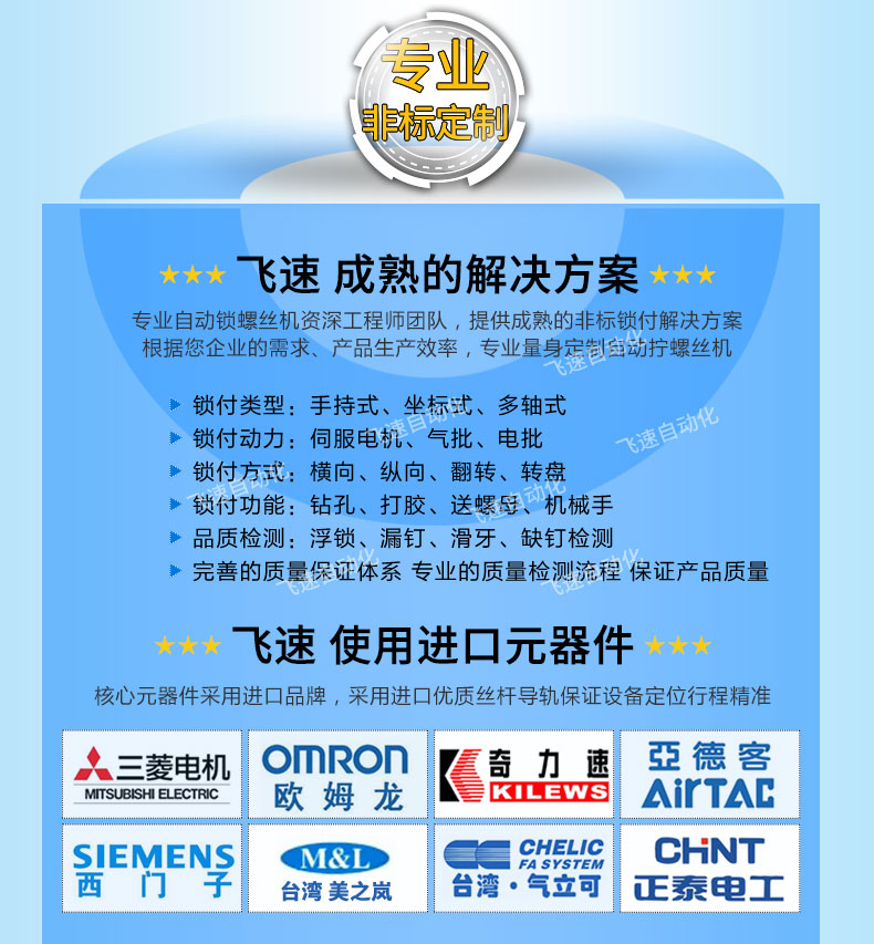 - 產(chǎn)品簡介: 自動鎖螺母設(shè)備 自動鎖螺母設(shè)備是我公司做的比較多的一類產(chǎn)品,之前設(shè)計過風(fēng)扇鎖螺母方案、輪心鎖螺母方案、加油泵鎖螺母方案、電機鎖螺母方案等。涉及各個不同行業(yè)零部件,設(shè)計方案也各不相同,多軸式、坐標(biāo)式、在線式方案都有涉及。本次的偏心套屬于軸承類產(chǎn)品,我公司采用防護罩防塵、震動盤上料、機械手取料等多種方法,另偏心套產(chǎn)品鎖付時間和風(fēng)險大大減低,從而提高了該公司的偏心套產(chǎn)能。