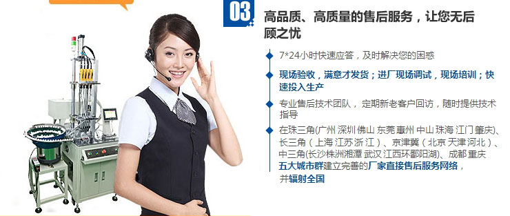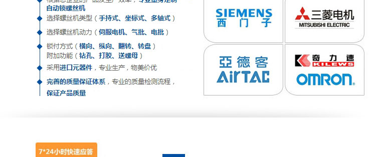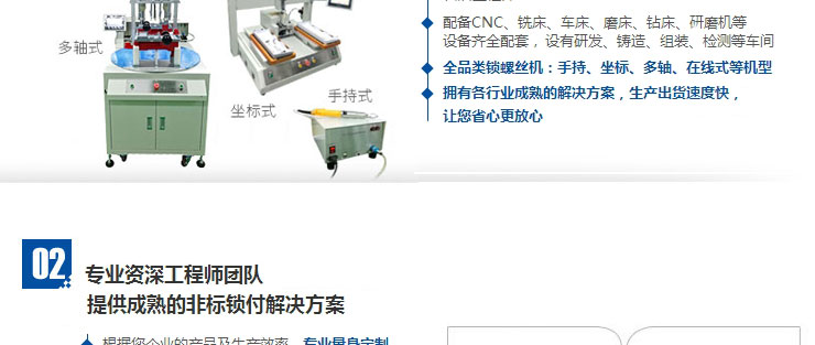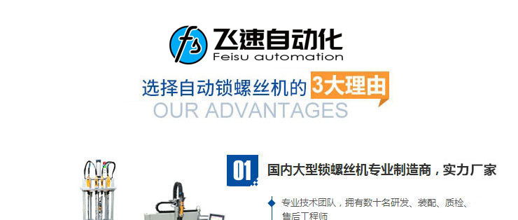 - 產品簡介:深圳市飛速自動化設備有限公司是國內大型自動鎖螺絲機制造商,飛速自動鎖螺絲機適用M1-M20規格螺絲,不限螺絲種類,自動鎖螺絲機支持漏鎖/浮鎖/滑牙智能檢測,重復精度±0.01mm。目前已在全國30多個省市設立售后服務,提供72小時以內的專業技術工程師上門售后服務。公司成立以來,與萬余家企業達成合作協議,其中上市公司亦有數百家。涉及各類行業領域:汽車電子、手機、數碼產品、電子電聲、玩具、LCD、LED,嬰童用品,家具家裝,五金配件,機器人,手表,眼鏡,體育器械等。 飛速自動化設備是一家實力廠家,主營業務為多軸式自動鎖螺絲機、坐標式自動鎖螺絲機、非標定制自動鎖螺絲機及流水線自動鎖螺絲機的設計、研發、制造、銷售以及技術服務。主導產品為多軸自動鎖螺絲機,主要包括固定式、轉盤式、機械手系列。系列全、品種多,性能可靠。多軸式自動鎖螺絲機效率可達每小時1200-1500件產品,1人代替8-12名操作工人。公司目前年均機器約產能 5000-7000 臺 ? ? ? ? 公司有員工350余人,廠房面積萬余平米,技術力量雄厚,配備CNC、銑床、車床、磨床、鉆床、研磨機等設備齊全配套,擁有臺灣進口CNC、自動化數控設備、鉆床、銑床、線切割、精密自動車床等加工機設備100多臺,設有研發、鑄造、組裝、檢測等車間,匯集了行業內眾多人才,技術水平高,實踐經驗豐富,響應客戶需求迅捷。現有研發人員130余人,形成了由行業工程師、技術核心、技術骨干的梯次人才結構。工廠目前還擁有數十項專利,以豐富的專利技術來面對市場不同的挑戰。